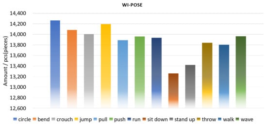 We aligned and split the collected videos and CSI through time stamps, and put each video frame and its corresponding CSI data in a formatted file. Therefore, there are about 12,000 to 14,400 data for each action. The data number of Wi-Pose is 166,600 and the specific number of each action is shown in Figure 3. After analysis and sorting, the Wi-Pose that is composed of human images, its corresponding CSI, and skeleton point annotations was finally established.