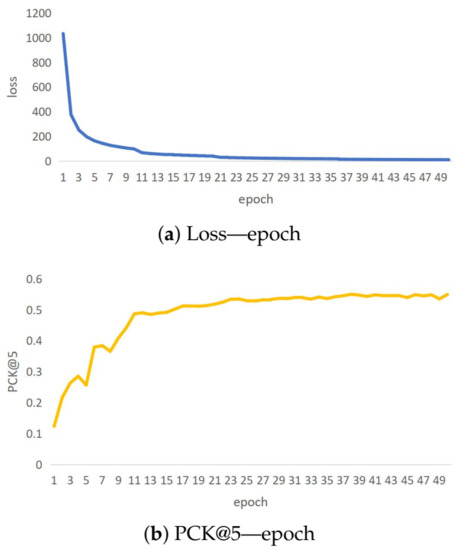 CSI-former stops training when the loss converges and the PCK reaches the highest level. This goal can usually be achieved by training 50 epochs. Thus, CSI-former has been trained for a total of 50 epochs. The trend graph of loss and PCK during training is shown in (a) and (b) respectively.