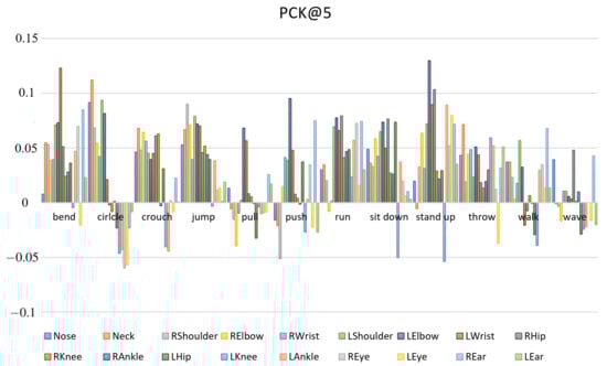 For each action, the vertical axis records the per-joint changes in the PCK@5 results of the proposed CSI-former relative to Resnet. The positive value means that CSI-former’s prediction accuracy for the skeleton joint is higher than Resnet.