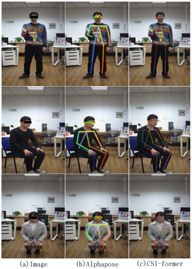 (a) records the original human images of three volunteers. (b,c) records the pose estimation results of the three original human images by Alphapose and CSI-former, respectively. Each pose estimation draws 18 key skeleton points of the human body and connects these skeleton points in the order of the human body on the original image. It should be noted that the estimation of CSI-former on some skeleton points is better than Alphapose.