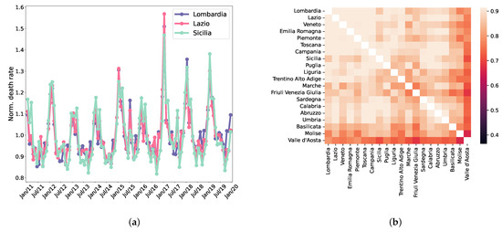 The course of monthly death rates, normalised to the mean over the entire period, is strikingly similar for different regions. This can be appreciated in Figure 1a, where we show three regions (chosen to be representative of the north—Lombardia, centre—Lazio, and south—Sicilia, of Italy).