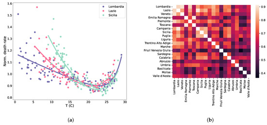 (a) Normalised death rates for three regions as a function of the temperature. The continuous lines are the results of a fit (see Equations (1) and (3)). (b) Pairwise between-region correlations for the time series of the deaths when the fitted effect of the temperature is subtracted from the raw numbers. Correlations drastically decrease (colour scale as in Figure 1b) but remain large.
