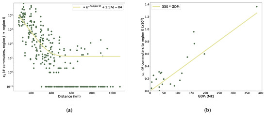 We hypothesise that strong correlations among regions also arise for an infective component, continually spreading from region to region at small time scales (less than a month), driven by the movement of people from one region to another. First, we examined the data about the flux of daily commuters between regions; such data show a clear dependence both on spatial distance (exponential decay; see Figure 3a; the continuous line is the result of a fit, see Equations (4) and (5)) and the GDP of the region of arrival, having the role of an ‘attractiveness’ factor (linear dependence; see Figure 3b, where the continuous line is the result of a fit; see Equations (6) and (7)).