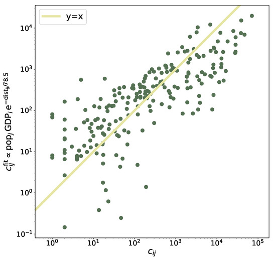 Actual commuters flux vs. the flux reconstructed by a fitted model that decays exponentially with the distance and grows linearly with the GDP of the region of destination (see Equation (8)). The continuous line is the identity line. Only non-zero entries of the commuters’ matrix are displayed and considered in the fitting procedure.