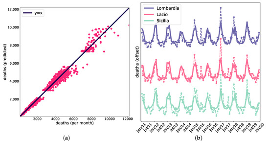 We fitted the model’s parameters (see Material and Methods) to the data. Figure 5a shows the death counts for all the regions and all the considered months against the death counts generated by the model. The model can reproduce a large part of the observed variability (corr = 0.993; the continuous line is the identity line). This can be appreciated, as the deaths evolve over time, in Figure 5b, for three different regions (dashed lines: data; continuous line: model). Note that the three time series are offset vertically to make the comparison data vs. model clearer.