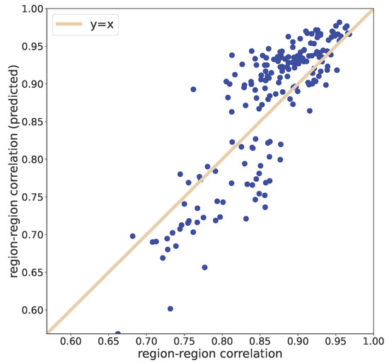 Finally, we compare, in Figure 6, the observed between-region correlations and the correlations between the time series produced by the model for each region. To a large extent, the model can capture the variability of the correlation among the regions (corr = 0.841; the continuous line is the identity line).