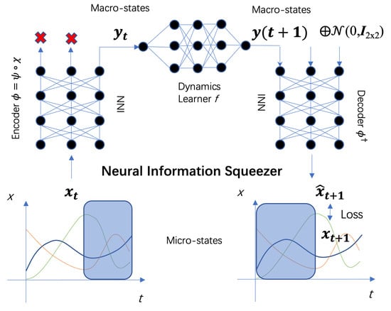 We propose a new machine learning framework called neural information squeezer (NIS) which is based on invertible neural network to solve the problem (Equation (6)). NIS is composed of three components: encoder, dynamics learner, and decoder. They are represented by neural networks , , and with the parameters , and respectively. The entire framework is shown in Figure 1. Next, we will describe each module separately.