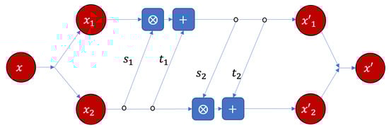 There are several ways to realize an invertible neural network [41,42]. Meanwhile, we select RealNVP module [43] as shown in Figure 2 to concretely implement the invertible computation.