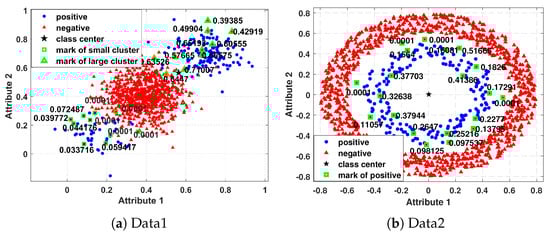 In Figure 1, we use IF to assign fuzzy values to some instances of Data1 and Data2. From Figure 1a, we can find that the fuzzy values of instances of small clusters of positive instances are generally low because the class center of positive instances is biased toward large clusters. Moreover, the fuzzy values of the instances that are closer to the class center in the small cluster are much smaller than that of the instances that are farther from the class center in the large cluster, and some instances in the small cluster are treated as noise. It can be seen that the fuzzy value obtained by the IF algorithm is unreasonable when the data hold small disjunctions. From Figure 1b, we can find that the fuzzy values of positive instances are generally low because the within-class centroid cannot describe the manifold structure well. Moreover, some important positive instances that are close to negative instances are judged as noise. This is because the instances are surrounded by negative instances, leading to many negative instances in the k-nearest neighbor, so the obtained non-membership degree will be greater than the membership degree, and such instances will be judged as noise.