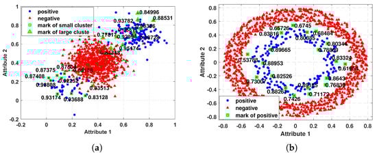 In Figure 1a, the instances of group i satisfy , where , , and . The numbers of these three groups are 800, 50, and 150 respectively. The instances of these three groups are divided into two classes, where the instances of group 1 are set to negative class and the instances of group 2 and group 3 are set to the positive class. So we obtain an imbalanced dataset with an imbalanced ratio of 1:4. In Figure 1b, the centroid of rings is , the width of the ring equals 0.2, and the inner radius of negative and positive classes is 0.6, and 0.3 respectively, we obtain an imbalanced dataset with an imbalanced ratio of 1:5.