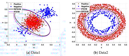 From Figure 3a and Table 1, we can find that for Data1, the IFSVM has a higher misclassification rate for small cluster instances of minority instances. This is because we can see from Figure 1a that the instances of the small cluster are endowed with lower final fuzzy values, especially some instances of the small cluster are judged as noise, resulting in these important instances will no longer contribute to separating the hyperplane and are likely to be misclassified. However, the classification result obtained by RIFSVM is much better, and the misclassification rate for the instances of the small cluster is also lower. From Figure 3b and Table 1, we can find that the misclassification rate of boundary instances of minority class by IFSVM is higher than that by RIFSVM. This is because the non-membership degree of these instances calculated by IFSVM is higher, which leads to the smaller fuzzy value, and then these instances are misclassified. Similarly, the evaluation measure G-mean, F-Measure, and AUC of RIFSVM are all higher than those of IFSVM. It can be concluded that our method is effective when tackling imbalance datasets.