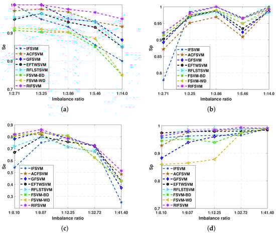 As shown in Figure 4a, the accuracy of these eight algorithms on the minority classes gradually decreases as the imbalance ratio rises, when the imbalance ratio is 1:14, the accuracy of minority classes of the seven algorithms decreases significantly. The accuracy of the proposed RIFSVM is slightly higher than that of other algorithms on the minority classes. When the imbalance ratio becomes large, the accuracy of RIFSVM decreases less than that of other algorithms. The results in Figure 4b show that the accuracy of these seven algorithms on majority classes gradually increases as the imbalance ratio increases. When the imbalance ratio is 1:5.46, the accuracy of majority classes of the seven algorithms is relatively low, which may be related to the dataset. The RIFSVM algorithm still outperforms other algorithms in the accuracy of most classes. From the results shown in Figure 4c, it can be seen that the accuracy of seven algorithms on the minority classes showed a downward trend as the imbalance ratio increased. When the imbalance ratio is 1:9.07, the accuracy of the eight algorithms is relatively high, which may be data related. The accuracy of the our algorithm is slightly better than the other seven algorithms for the minority classes because the algorithm uses relative density to calculate the fuzzy value of the instances and makes full use of the distribution characteristics of the instances. From the results of Figure 4d, we can find that the accuracy of these seven algorithms on majority class increases slowly as the imbalance ratio increases. When the imbalance ratio reaches the maximum, the accuracy of the eight algorithms reaches the highest, indicating that when the imbalance is relatively large, the classifier will still bias toward the majority class. In addition, it can be seen that the accuracy of the FSVM-WD algorithm on the majority class is lower than that of other algorithms. It may be because the algorithm only uses the within-class relative density of instances, which results in inaccurate fuzzy values.