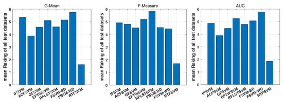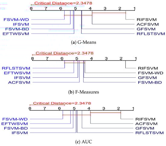 As can be seen from Figure 6b, our algorithm is optimal in F-Meansure, and it is significantly superior and different from other algorithms. From Figure 6a,c, we can see that our algorithm is optimal in G-Mean and AUC, and is significantly superior different from other algorithms except for ACFSVM. The ACFSVM is only inferior to our method while superior to the other six algorithms in terms of G-Mean and AUC, but it’s not doing very well on the F-Measure. The FSVM-WD and FSVM-BD perform better on F-Measure but are the worst on both G-Mean and AUC. The GFSVM performs generally well in all indicators, and IFSVM, RFLSTSVM and EFTWSVM are mediocre in terms of G-Mean, F-Measure, and AUC. In general, our RIFSVM achieves statistically superior performance on the whole twenty datasets.