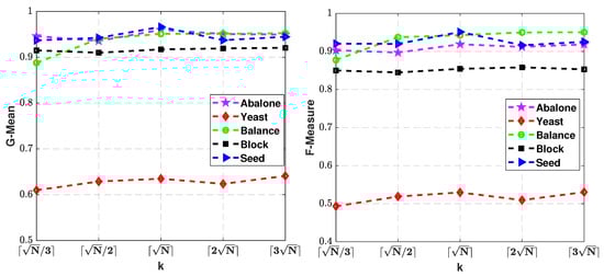 In order to evaluate the influence of the parameter k for relative density calculation on the classification performance of our proposed approach. It is selected from the set . The variation of the G-Means and F-measures with the variation of parameter k on the five chosen datasets is then plotted in Figure 7.