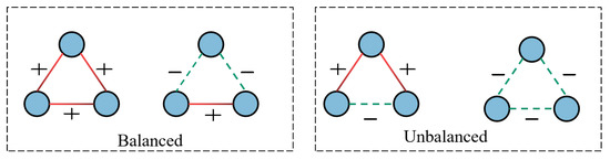 Several studies have been conducted to solve the problems of predicting signed links [4,5,6,7], some earlier approaches adopted normalized spectral analyses model, log-bilinear model and so on. Although the approaches have successfully achieved signed link prediction, they have some drawbacks. To begin, they are very dependent on features that have been manually constructed and do not perform well when applied to real-world settings. Moreover, they ignore that signed networks carry special properties on their edges. To address these flaws, studies on automatic feature extractions for signed link prediction [8,9,10,11] have been conducted that aims to learn fixed-length vector representations for each node by constraining the node’s proximity. In particular, several studies adopted graph neural networks to mine the potential information from the signed networks because it is the most powerful technique for identifying the representation required from a large data set, replacing manual engineering, and allowing the systems to both understand and use the features to perform tasks such as community detection [12], node classification [13] and link prediction [14,15,16]. These techniques modeling signed network follow message passing neural networks with social theory constraints (such as the balance theory). According to the social theories, nodes in the signed network with positive relations are embedded near together, whereas nodes with negative relations are embedded far apart. Figure 1 provides a straightforward summary of the balance theory. The two triangles on the left of Figure 1 are structural balance triangles. In contrast, in the unbalanced structural triangles on the right, the relationship between a pair of nodes is both friend and foe. SGNNs have been shown to achieve promising results on many signed graph analytic tasks. However, none of the existing methods take the individual characteristics of the nodes into consideration, which is critical for improving the representation power of a graph. This is because individual characteristics may transmit potential attribute information of nodes to guide the representation learning process.