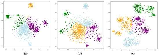 To verify the effect of personalised features on the quality of node embedding, we performed a node embedding vector visualisation on the Bitcoin-Alpha dataset using the k-means algorithm with a category of 4 as shown in Figure 5. The node embeddings of the baseline algorithms SGCN, SNEA were taken out and visualised in two dimensions before being passed to the classifier. The different colours represent the different node class and it can be clearly seen that the embedding vectors obtained by SiNP can better cluster the nodes of different class and the distance between similar nodes is smaller.