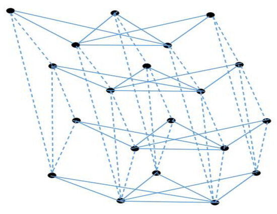 In this case, a class of multi-layered star-composed structure is considered. Each layer can be viewed as several star-shaped copies formed into the complete subgraph by the center vertices (see Figure 3), and all layers are connected only through black counterpart nodes. It can be seen as the fan graph from the side view perspective. Define , and denote the corresponding noisy network by .