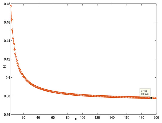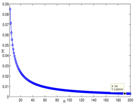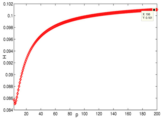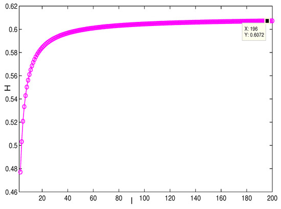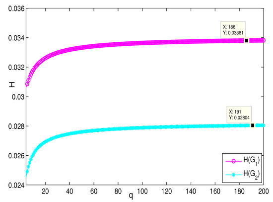 This section presents the simulation and comparisons of the coherence for these multi-layered MASs. Figure 4 shows the changes in the coherence with the parameters a and q. These results coincide with the results that Section 3.1 shows; i.e., if m is fixed, then as . It coincides with results (i) and (iii) in Section 3.1. In Figure 5, the surface is for with the changes in m and q, when . The figure implies that as , which satisfies results (i) and (ii) in Section 3.1. Figure 6 shows the changes in coherence of and with the changing of parameter q, i.e., the number of layers; the node related parameters were chosen as: and . These satisfy the condition that Remark 2 mentioned: . One can see that is a bit larger than in the range of all q, which satisfies the previous result. Figure 7 shows the changes in and with q, when the other parameters were chosen as . Figure 8 describes the variation in with m, when . From the point (197, 0.001469) and the decreasing trend of the curve, one can see that when , the coherence coincides with the result in Section 3.1. In Figure 9, the point (194, 0.001072) and the curve reflect the change trends of with a, when ; that is, . This also coincides with the previous result. Figure 10 describes the monotonous increasing trend of with p. From the former section, we know that when n and q are fixed, will tend to a certain value, and the point (196, 0.101) satisfies the result. This coincides with the figure’s description. In Figure 11, the curve and the point (191, 0.003161) shows the trend that monotonously decreases to 0 when . Figure 12 implies the decreasing trend that will tend to a certain value when , and the certain fixed value is related only to l. In this figure, ; the point coincides with the result that the former section derived. In Figure 13, the increasing curve implies the trend that will tend to a certain value which is related to n and q; at , the point (196, 0.6072) is consistent with this fact. One can see that the points on the curves satisfy both the mathematical expression of coherence and the asymptotic results. The simulations also verified the size relation of the three cases when the corresponding layers have the same number of nodes. In summary, the mathematical expression results, the integral calculations, and the simulation with partially fixed parameters are consistent.