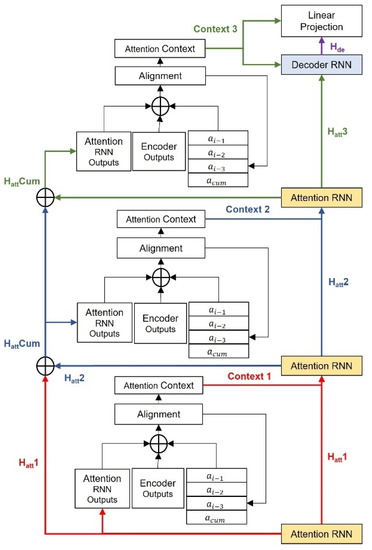 The decoder is a DIA-based autoregressive RNN mechanism. It consists of four unidirectional LSTM layers: three attention RNN layers and one decoder RNN layer, each with 1024 hidden units in our model that act like a Mel-channel feature extractor and provide the details of the time series dependency between each Mel-spectrogram frame, as well as the time steps for attention alignment. During training, the predicted Mel-frames from the last iteration were passed through a pre-net consisting of two linear normalization layers with 256 hidden ReLU units, followed by a dropout layer with a frequency rate of 0.5. Then, the processed frames were fed into the four-layer RNN block that produces three attention hidden states and one decoder hidden state. The three attention hidden states were used as attention queries for repetitive attention alignment at each decoder time step. A residual connection was adopted to integrate attention with the hidden states at each iteration, as shown in Figure 2. This helps to achieve tight connections among neighboring tokens, as well as increases time dependencies. During each process, the attention RNN layers take a combination of latent information from the previous RNN layer and the corresponding attention context as the input. The additional RNN layers increase the depth of the network, which contributes to better acoustic feature extraction. The multi-layer RNN structure also serves to adjust the attention alignment dynamically, which optimizes the consistency of the decoding procedure, therefore avoiding robustness errors and unexpected outcomes, including under and over generation, wrong sentence duration, and inappropriate prosody phrase breaks.