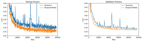 Convergence rate in loss using Tacotron2 (blue) and the proposed inherited Attention Tacotron2 (orange) during training and validation processes.
