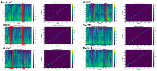 During the ablation studies, the same representative input text from the following LJ Speech recording were transferred into speech by six different models: “Visited Mr. Fauntleroy, my application for books for him not have been attended, I had no prayer book to give him”. Figure 7 represents the Mel-spectrogram predicted by models with a different attention inheritance depth and LSF. Based on the Mel-spectrograms, we can see that the models with multiple inheritance depths correctly predict the right pause position, while Tacotron2 misses the first pause, as shown in the red box. Furthermore, the comparison of the attention alignments tells us that the proposed DIA-TTS model (inheritance depth = 3, LSF = 4) and Model 4 (inheritance depth = 4, LSF = 5) have brighter and clearer encoder–decoder alignment lines, indicating a stronger attention robustness. As the increment in attention inheritance depth elongates the inference process when synthesizing the same length of sentence, Model 4 costs an average of 1.625 s to generate one speech. However, the proposed DIA-TTS model produces relatively the same quality of speech but with a faster generation time of 1.310 s. Therefore, the DIA-TTS with an attention inheritance depth of three and LSF of four is considered the optimal one for speech synthesis. The results of the MOS from different models and the average inference time for 50 randomly selected sentences can be found in Table 2.