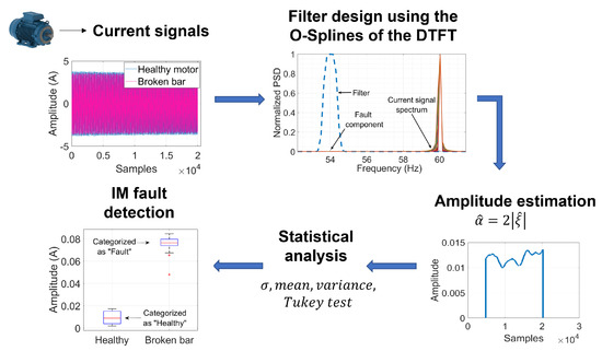 The diagram of Figure 1 illustrates the steps that structure the proposed methodology for broken bar detection using the DTFT. First, current signals for different health conditions of the motor need to be acquired. Then, the characteristics of the Taylor–Fourier filters can be selected to perform an amplitude estimation in a frequency of interest. Afterward, a statistical analysis is performed over each group of amplitude estimations. Then the variance analysis is carried out. Hence, discrimination between healthy and damaged rotor bars can be conducted, resulting in the detection of the fault. Next, each process is explained.