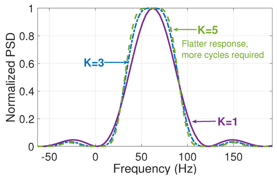 Finally, the number of Taylor polynomials (K) is another important design parameter, considering that as this number increases, it is necessary to analyze more windows in the time domain. Still, at the same time, the filter response around the frequency of interest tends to be flatter and, therefore, more likely to be an ideal filter [29]. As can be observed from the normalized power spectral density (PSD) in Figure 2, the filter corresponding to presents a flatter response and better harmonic rejection than, for example, the one with , Nonetheless, the first one requires more cycles of the signal to implement it.