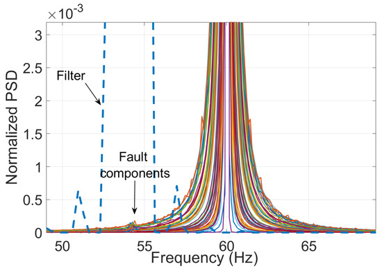 To showcase the improvement using Taylor–Fourier filters, the proposed methodology is repeated but using a value of , i.e., Fourier filters. As illustrated in Figure 12, the filter exhibits a poor harmonic rejection, giving as a result, the inclusion of undesired energy in the analysis.