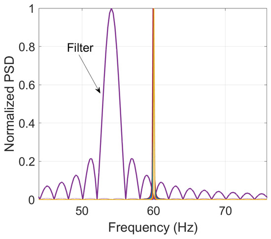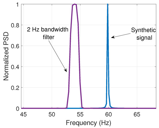 It is worth noticing from Figure 7 that the spurious component represents a very small part of the signal’s energy. Besides, it lies near the center frequency of 60 Hz. For this reason, a bandwidth of 2 Hz was selected for the filters to avoid including other components that are irrelevant to the analysis. To illustrate this, Figure 9 shows the same 2 Hz bandwidth filter with a 54 Hz and the frequency spectrum of a synthetic 60 Hz signal to remark that the reduced bandwidth excludes the energy of the fundamental component.