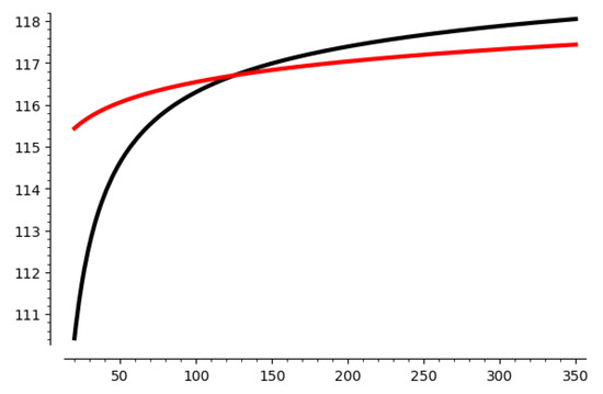 Let us take 116-1 HNP as an example. We show how the number of samples affects and in Figure 1. The x-axis stands for the number of samples used for sieving. The y-axis stands for the value of and , since they are functions of . The red line is and the black line is . The crossing point is the value of we choose to solve HNP. When , which means that the red line it lower than the black line, the HNP is believed to be solvable, and the corresponding minimum is the samples we use for sieving.