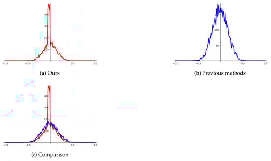 Comparison of the cosine distribution. The x-axis stands for the cosine value and the y-axis stands for the number of angles with cosine equal to x-axis. “Ours” is our pre-processing step and “Previous methods” is the other BKZ methods.