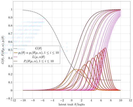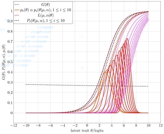 When one wants to explain some relationship between latent traits of individuals, for instance, unobservable characteristics or attributes and their manifestations (observed outcomes, responses, or performance), then item response theory (IRT) becomes a valuable formal tool. IRT is a family of models to analyze and predict the behavior of the involved variables, and their applications cover different assessment scenarios. Item exposure control, item calibration, and automatic item generation are only some examples of these scenarios and the involved variables. From a theoretical point of view, there are several well-known models to analyze these topics and potentially helpful tools to propose novelty solutions [1,2,3,4,5]. These models consider a set of items to define a measurement instrument. One set of parameters specifies the item’s characteristics that depend on the particular application. The results of the application of the measurement instrument provide information about the examinee’s latent trait. IRT assumes that the latent construct values (e.g., stress, knowledge, attitudes values) and some items’ parameter values are organized in an unobservable continuum as random variables. Thus, IRT helps to establish the position or value of the examinee’s latent trait on that continuum by considering the items’ characteristics and the quality of responses to them [6,7].
