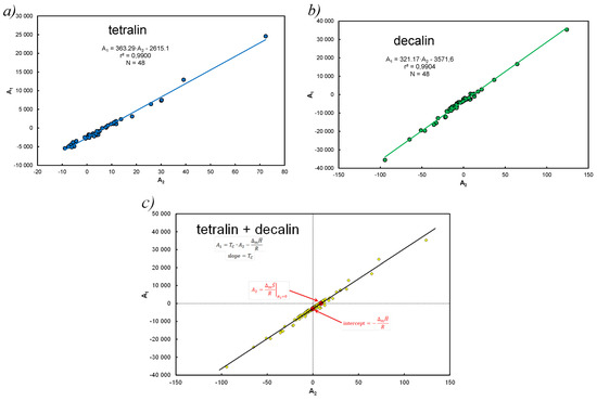 The determined coefficients of the Equations (28)–(31) were correlated in the form of a linear relationship: vs. assuming 4 × 12 = 48 pairs of coefficients for tetralin and identically for decalin. The graphical correlation image is shown in Figure 3. Figure 3c is the combined set of all data.