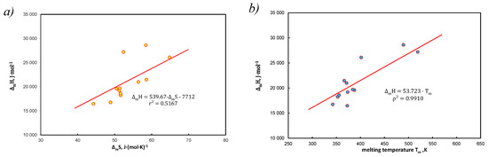 EEC diagram for 12 polynuclear aromatics at melting temperature, data from [21] (a) typical relation H vs. , (b) different approach, slop determines average entropy, = 53.7 J*(mol*K)−1, in accordance with [40].