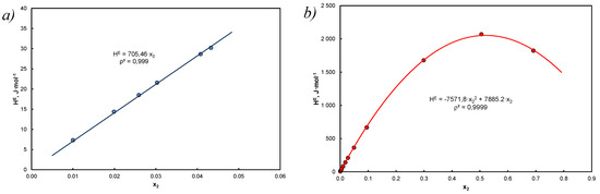 Thus, for Equation (15), enthalpies are expressed by Equation (20) and entropy by formula Equation (21). Ratios: Equation (20)/Equation (21) = , and approximate also Equation (19)/Equation (24) = (Figure 1) which is consistent with the basic formula Equation (5). In the dissolution processes, an enthalpy invariant with respect to temperature is assumed, i.e., Meanwhile, in Equation (19) an additional functional element appears, which means that . The comparison of Equation (14) and Equation (15) shows that that is which is according to Kirchhoff’s law, Equation (10a). When , then in Equations (15) and (27) the term in which entropy may appear disappears. There is a clear tendency to assign certain equations to experimental results. When studies are conducted near melting temperature, this is either or/also and the Hildebrand Equation (11) is reduced to the van ’t Hoff isobar, Equation (9).