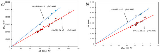 In this way, it was proved that Equation (15) is also EEC, because it contains in its meaning a straightforward linear relationship between enthalpy and entropy without intercept, when we operate with activity.