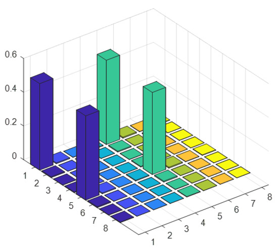 Here, we use a non-Hermitian matrix M and construct a new Hermitian matrix B by Equation (7). We often pay more attention to the singular vectors corresponding to the larger singular values, such as in recommendation systems. The experiment details of solving singular-value problems are similar to Section 3.1, which are omitted here. Figure 5 shows the reconstructed density matrix of the left and right singular vectors of the maximum singular value, and the fidelity is 98.44%.