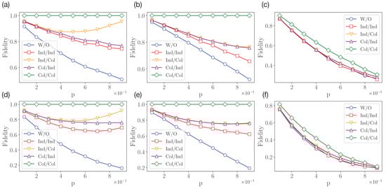 Simulation results for qubit (a–c) and qubit (d–f) cases. The amplitude damping (a,d), dephasing (b,e), and depolarizing (c,f) channels are considered.