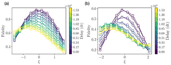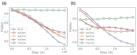 It is also important to note that the form of the decoherence channel is not exactly known. One can expect that has a tensor product form of single-qubit channels, each consisting of depolarizing, dephasing, and amplitude damping ones []. However, certain collective decoherence effects can also take place due to a qubits’ crosstalk. That is why, to optimize the parameter of the collective protecting operation , we perform additional measurements. We demonstrate the resulting dependence of the input–output fidelity on the angle in Figure 7. We observe the drift in the optimal parameter with the increase in delay time. This highlights the usefulness of utilizing the collective operator in this case.