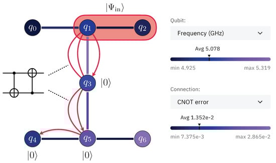 Here, we consider a practical problem of distributing a two-qubit state over remote physical qubits of a quantum processor. Specifically, we analyze distributing the entangled state inside the cloud-accessible seven-qubit ibm_oslo quantum processor (see Figure 9). This can be considered as a prototype experiment for realizing quantum state transfer between distinct quantum information processing devices connected via a quantum interface [].