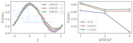 The result of the optimization of the parameter and the resulting input–output fidelities are shown in Figure 12. We note that as this is a practical example, the experimental data was obtained from transpiled circuits. We provide the results of several protocol runs corresponding to a different number of SWAP operations. One can observe a sizable increase in fidelity compared to the unprotected case.