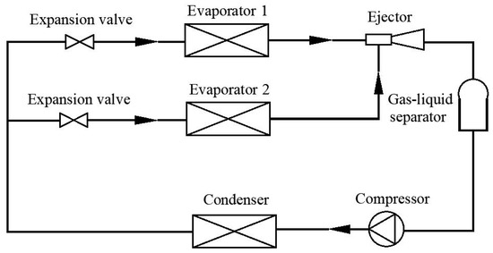 With the rapid development of technology, energy consumption has restricted economic and social development. Therefore, it is quite urgent to improve energy efficiency in air-conditioning and refrigeration devices [1,2]. Various studies have been conducted to improve the performance of refrigeration systems and thus solve environmental issues [3,4,5]. Moreover, the performance of refrigeration systems has been enhanced by adopting advanced technologies [6,7,8,9]. For the refrigeration needed in refrigerated trucks that always need air-conditioning services and refrigerating or freezing purposes for food storage, a pressure regulating valve (PRV) is equipped between two evaporators to keep the required pressure difference [10,11], which causes many irreversible throttling losses. Therefore, an ejector is used to replace the PRV and partially recover the throttling losses [12,13,14]. The schematic of a typical simplified EMERS with two temperature levels is shown in Figure 1 [15]. An EMERS has some advantages such as low operating costs [16,17].