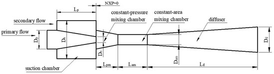 High entrainment performance of the ejector can be achieved if the two flows are mixed well [23]. Nakagawa et al. [24] studied the effect of mixing the length of a transcritical CO2 two-phase ejector with a rectangular cross-section, and they claimed that the 15 mm of mixing length can produce good ejector performance. Sarkar et al. [25] showed that the constant-area mixing chamber cross-section area affects ejector performance mainly depending on the ejector inlet conditions. Banasiak et al. [26] also proved that the ejector performance largely depends on the mixing chamber length in a small ejector-based R744 transcritical heat pump system. Jeon et al. [27] studied an ejector mixing length and improved system performance. Fu et al. [28] optimized the mixing chamber throat diameter to improve the steam ejector performance. By using three-dimensional numerical simulations, Dong et al. [29] studied the effects of the mixing chamber length, and the best ejector performance was obtained within a certain range of the mixing chamber length.