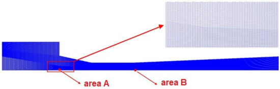 Figure 3 presents the 2-D axisymmetric quadrilateral grid configuration for the baseline ejector. As shown in Figure 3, the pressure and velocity at Point A and Point B are used to detect the influence of the cell number. Table 3 and Table 4 display the grid independence verification results. Pressure and velocity errors with area A and area B are less than 0.5%, indicating that the results are within the acceptable ranges; thus, the medium one with a grid number of 83,100 is selected.