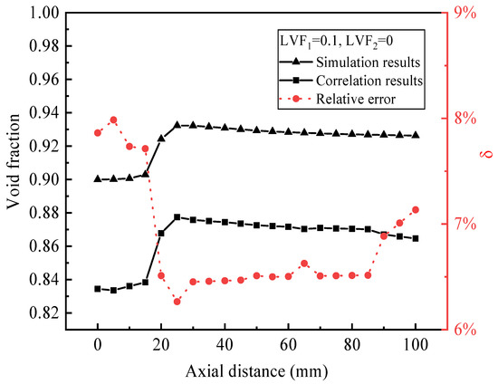 The CFD model is validated by the void fraction inside the ejector which is based on the experimental results [15]. Take a typical case as an example, when LVF1 is 0.1 and LVF2 is 0. As shown in Figure 4, the maximum discrepancy is within 7.9%. The maximum deviation of for many other ejector dimensions does not exceed 15%; thus, the model can be used in the following simulation.