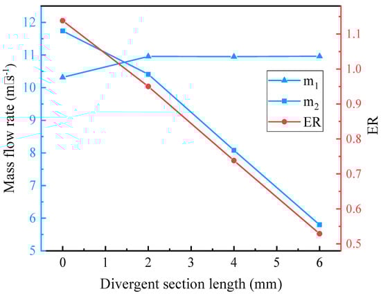 As for the selection of a convergent nozzle, the comparison between the converging and the converging-diverging nozzle is presented below. For single-phase primary and secondary flow, based on the initial geometries, when the NXP is fixed at 0 mm and primary nozzle diverging section length is varied with 0 mm, 2 mm, 4 mm, and 6 mm, mass flow rates and ER are displayed in Figure 5. It is clear that, with the increase of the divergent section length, m1 has little change, m2 decreases significantly, and correspondingly, ER decreases with the increases in divergent section length. Moreover, the corresponding Mach number contours are shown in Figure 6. Hence, the converging nozzle is selected.