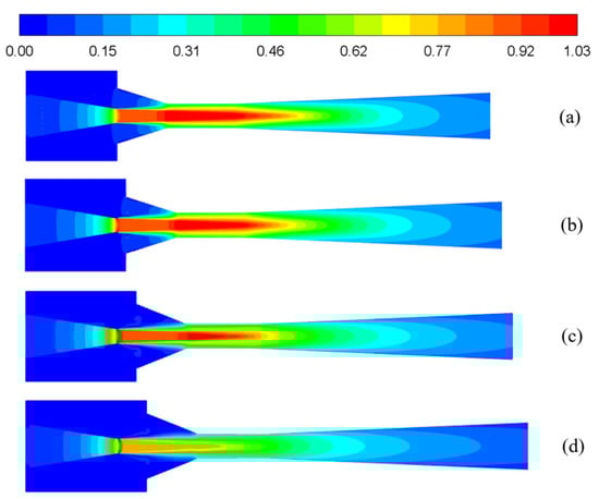 The Mach number contours under different nozzle diverging section lengths: (a) 0 mm; (b) 2 mm; (c) 4 mm; and (d) 6 mm.