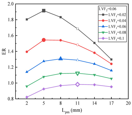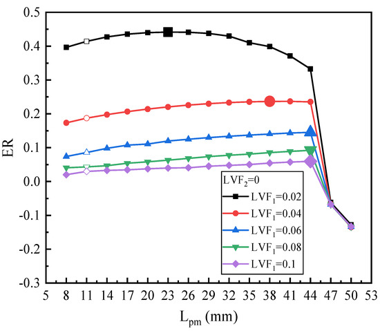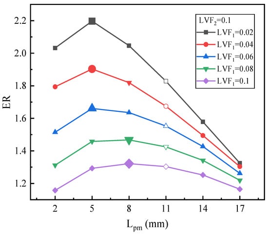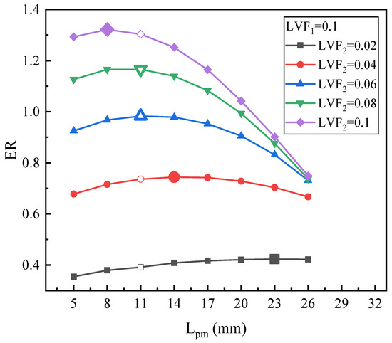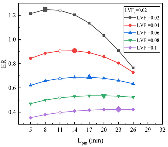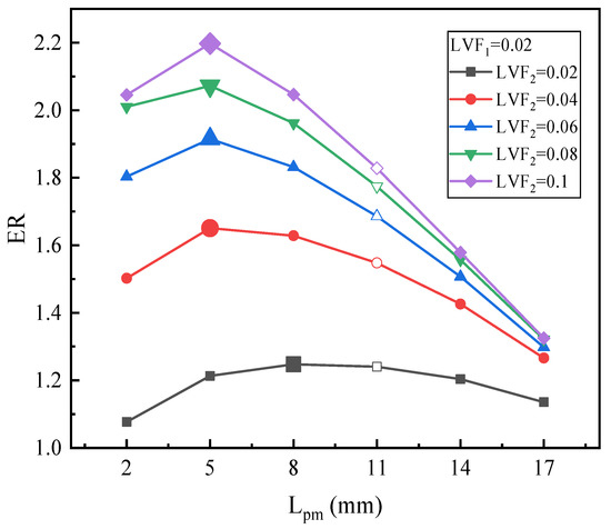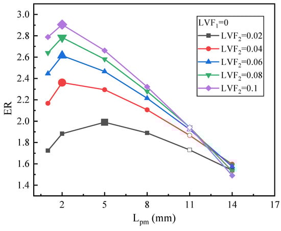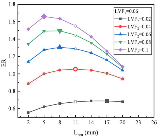 Figure 12 illustrates the changing trend of ER with Lpm under fixed LVF1 of 0.1 and various LVF2. For LVF2 of 0.02, the maximum ER is 0.423 with Lpm = 23 mm, which increases by 9.59%. For LVF2 of 0.04, the highest value of ER, 0.744, is achieved at the Lpm of 14 mm. Both for LVF2 of 0.06 and 0.08, the maximum ERs (0.983 and 1.166, respectively) are obtained when Lpm reaches 11 mm. Moreover, similar to Figure 10, as LVF2 increases from 0.02 to 0.1, the optimal Lpm is reduced gradually, since the optimal Lpm is 23 mm, 14 mm, 11 mm, 11 mm, and 8 mm, respectively. However, compared with Figure 10, namely when LVF1 increases from 0.06 to 0.1, for each fixed LVF2, each optimal Lpm increases slightly, but the maximum ER drops.