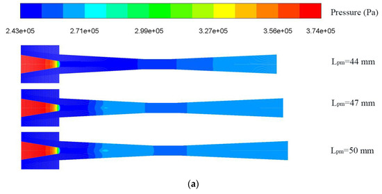 Figure 7 displays the ER with Lpm under LVF2 = 0 and varied LVF1 (the unfilled point indicates the baseline ejector model). It can be observed that for different LVF1, ER always first rises moderately and then decreases steeply. To be specific, for LVF1 of 0.02, when Lpm is increased from 8 mm to 50 mm, ER increases and peaks at Lpm of 23 mm which is magnified for the legend. After the peak value, ER drops slowly at first, then it falls suddenly, and even backflow occurs. Similarly, ER under LVF1 of 0.04 also rises first and then reaches the peak of 0.237 at Lpm = 38 mm; the maximum ER increases by 26.58% over the baseline ejector. When LVF1 are 0.06, 0.08, and 0.1, all the highest ER (0.145, 0.0922, and 0.0596, respectively) are achieved with Lpm of 44 mm. In addition, after the maximum value, the ER decreases suddenly to a negative value. To elucidate the abrupt drop of ER, contours of static pressure and axial static pressure distribution for the Lpm of 44 mm, 47 mm, and 50 mm are displayed in Figure 8a,b, respectively. Note that the amount of secondary fluid mass flow depends on how much pressure drop is induced at the outlet of the primary nozzle. Obviously, for Lpm = 44 mm, the static pressure rises smoothly, which can improve ejector performance. While for Lpm of 47 mm and 50 mm, higher pressure is generated, which weakens the ejector performance. When Lpm increases to 50 mm, the area of the high-pressure region increases, which further results in a decrease in ER. In addition, from another perspective, with the increase of Lpm, these two fluids mix more sufficiently, and correspondingly, the entrainment performance is enhanced; however, the increase of Lpm will also lead to the increase of frictional loss. Therefore, ejector performance suddenly decreases as Lpm increases to a certain value. As displayed by the velocity contours in Figure 8c, the energy loss increases largely when Lpm increases from 44 mm to 47 mm. For this purpose, Lpm should not exceed 44 mm for a proper operation of the ejector.