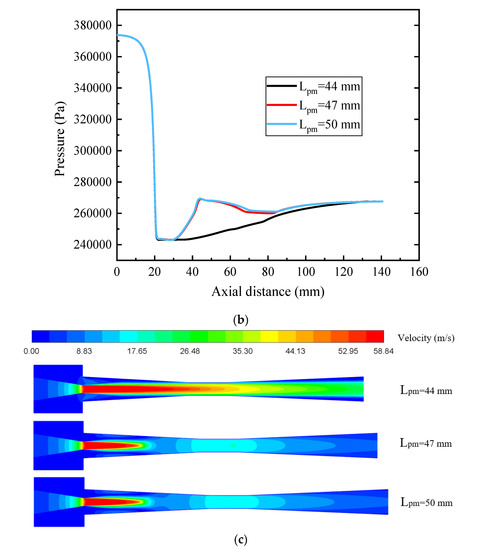 Pressure inside the ejector with different Lpm under LVF1 = 0.06 and LVF2 = 0: (a) Contour of static pressure; (b) Static pressure along the centerline; (c) Contour of velocity.